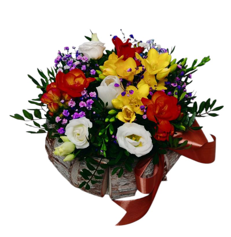 Acest coș rotund din lemn, cu un design rustic și elegant, adăpostește un aranjament floral deosebit, care combină frumusețea naturală cu o notă de rafinament. Freziile, cu parfumurile lor îmbietoare și florile delicate, aduc o prospețime delicată, în timp ce lalelele, cu formele lor elegante și culorile fine, adaugă o notă de vitalitate și culoare.