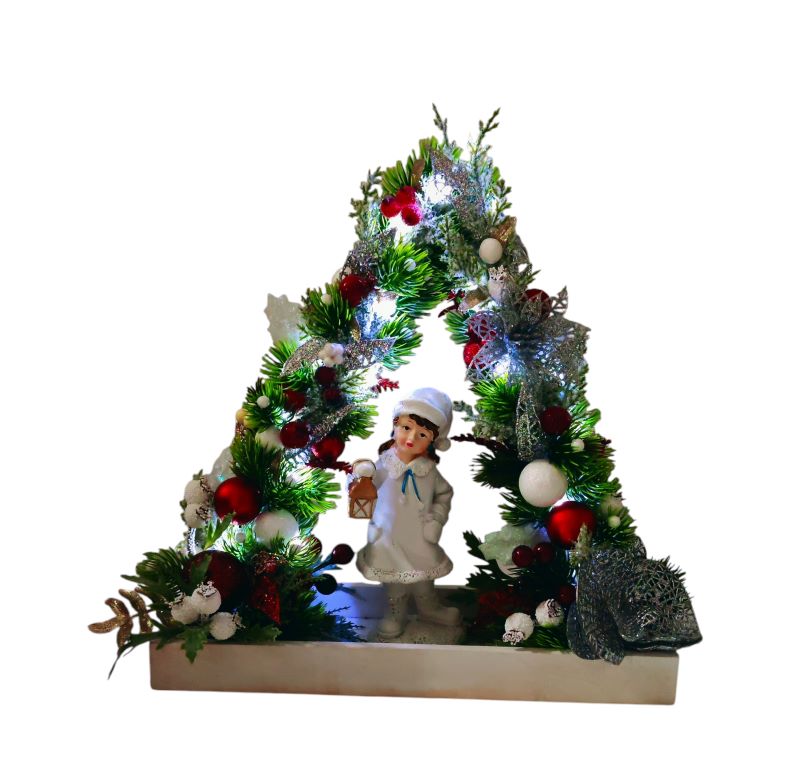 Aranjamentul este decorat cu globulețe festive și o instalație cu leduri alimentată pe baterii, oferind o lumină plăcută și o atmosferă caldă de sărbătoare. În mijlocul compoziției se află o figurină ceramică reprezentând o fetiță de Crăciun, elementul central care completează scena într-un mod armonios și delicat.
