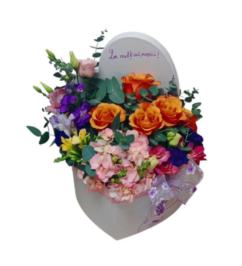 Acest aranjament floral in cutie in forma de inima este o adevărată declarație de iubire și frumusețe. În interiorul cutiei se aflătrandafiri portocalii , cu petale bogate și vibrante, care aduc un strop de căldură și pasiune. Freziile multicolore îmbogățesc aranjamentul cu nuanțe de galben, alb și roz, iar lisianthusul mov si roz adaugă o notă de finețe și eleganță. Hortensia roz, cu volumul său impresionant, oferă un contrast delicat și un aer romantic, iar eucaliptul completează perfect aranjamentul, cu frunzele sale verzi care adaugă un accent natural și proaspăt. Împreună, aceste flori creează un ansamblu floral sofisticat și plin de culoare, ideal pentru a transmite emoții deosebite.