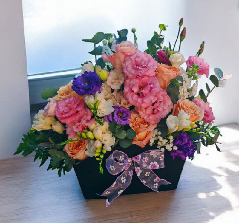 Un aranjament floral cu adevărat special, realizat cu grijă într-o cutie decorativă dreptunghiulară, perfectă pentru a evidenția frumusețea florilor. Compoziția combină trandafiri eleganți, lisianthus delicat și frezii parfumate, oferind un echilibru între culoare, textură și parfum. Crenguțele de eucalipt adaugă prospețime și un aer modern, în timp ce gypsophila (floarea miresei) conferă o notă fină și aerisită. Frunzele verzi decorative completează armonios aranjamentul, oferindu-i un aspect natural și bine structurat.