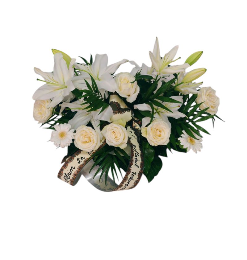 Un aranjament floral sobru și rafinat, creat special pentru a fi așezat pe capacul sicriului în cadrul ceremoniei de adio. Simplitatea culorii albe, îmbinată cu echilibrul floral, exprimă respect, liniște și puritate – un ultim omagiu oferit cu demnitate.