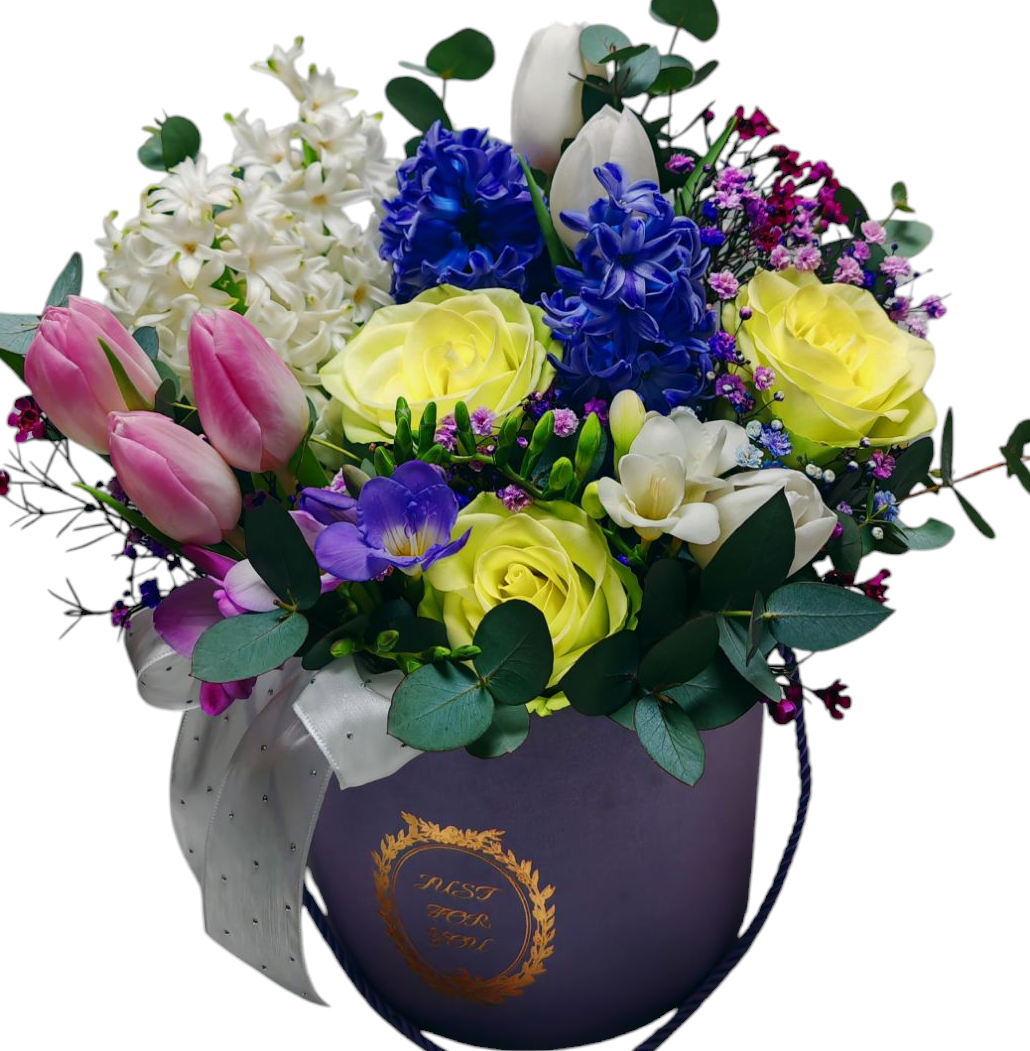 Zambilele albe și mov, cu formele lor elegante și parfum intens, sunt plasate în centrul aranjamentului, aducând un aer proaspăt și primăvăratic. Lalelele albe și roz, cu petale fine și delicate, completează imaginea cu o nuanță subtilă de gingășie și feminitate, în timp ce trandafirii, cu petale catifelate și pline de farmec, aduc o notă de eleganță și romantism.Freziile, cu florile lor delicate și parfumate, sunt aranjate cu grijă pentru a adăuga un strop de prospețime și veselie, iar eucaliptul verde, cu frunzele sale lucioase și parfumate, conferă un contrast natural și rafinat, legând întreaga compoziție florală într-un echilibru perfect.Deasupra, o fundă elegantă de organza, cu textura sa fină și lucioasă, completează această cutie cu un detaliu sofisticat, adăugând un aer de lux și rafinament întregii prezentări.