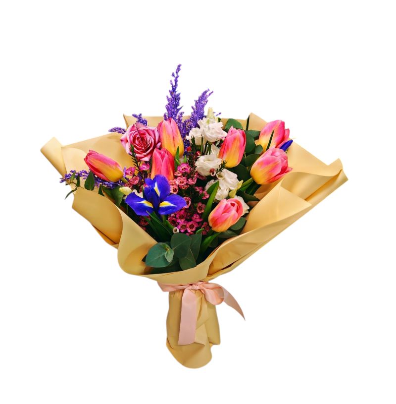 Buchet vibrant și elegant, creat din lalele în două nuanțe delicate de galben și roz, iriși rafinați, solidago mov, miniroze albe și wax flower roz, completate armonios de frunze verzi decorative. Compoziția îmbină culori calde și pastelate într-un ansamblu echilibrat, plin de prospețime și rafinament.