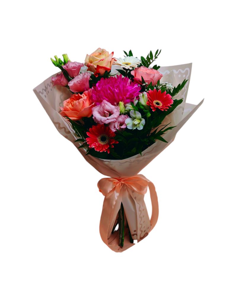 Florile sunt armonios dispuse într-o compoziție echilibrată, cu un aer proaspăt și modern. Buchetul este ambalat elegant, în materiale fine, care completează frumusețea naturală a florilor, fără să o umbrească.