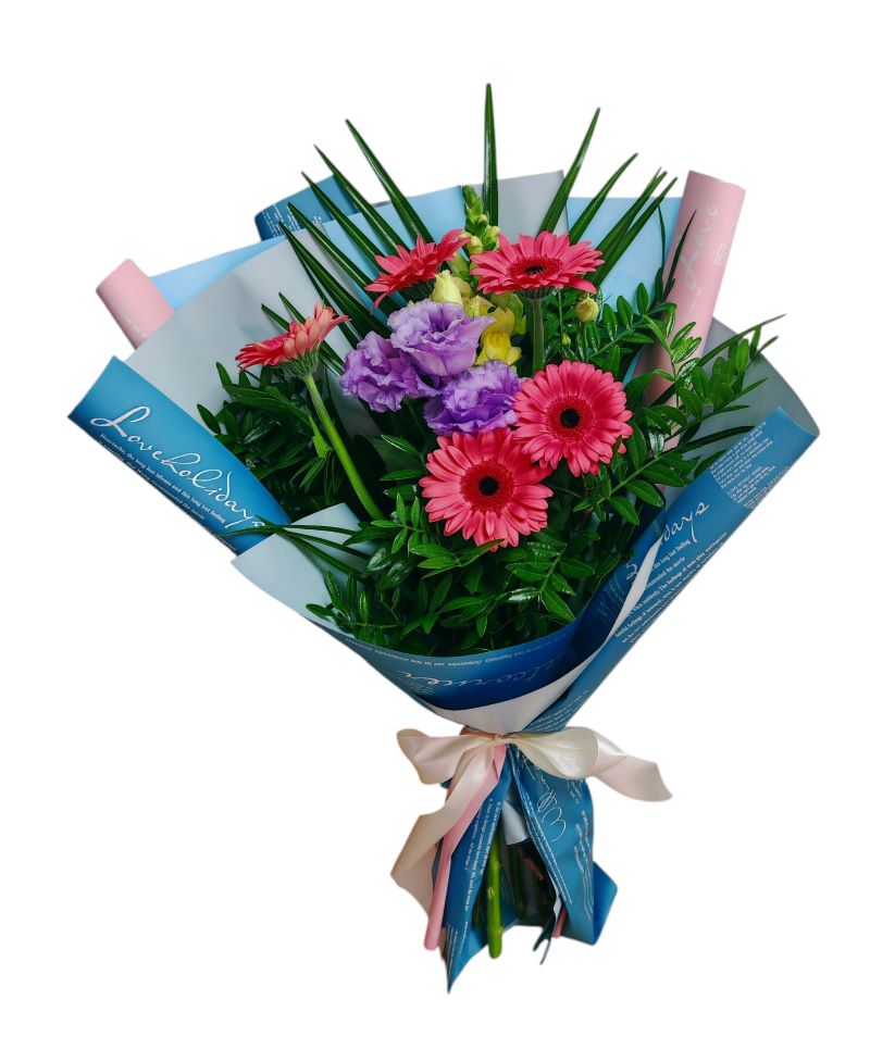 Un buchet simplu, dar deosebit de frumos, alcătuit din flori fine și expresive: minigerbera plină de veselie, lisianthus delicat și antirrhinum cu formă grațioasă. Frunzele verzi decorative de pistacia adaugă un plus de prospețime și naturalețe compoziției.