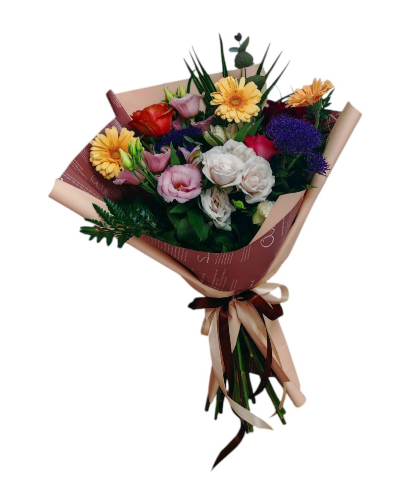 Un buchet elegant și plin de farmec, creat dintr-o selecție rafinată de flori: miniroze delicate, trandafiri catifelați, minigerbera veselă, trachelium bogat, lisianthus fin și eucalipt parfumat. Frunzele verzi decorative completează compoziția, oferind prospețime și echilibru vizual.