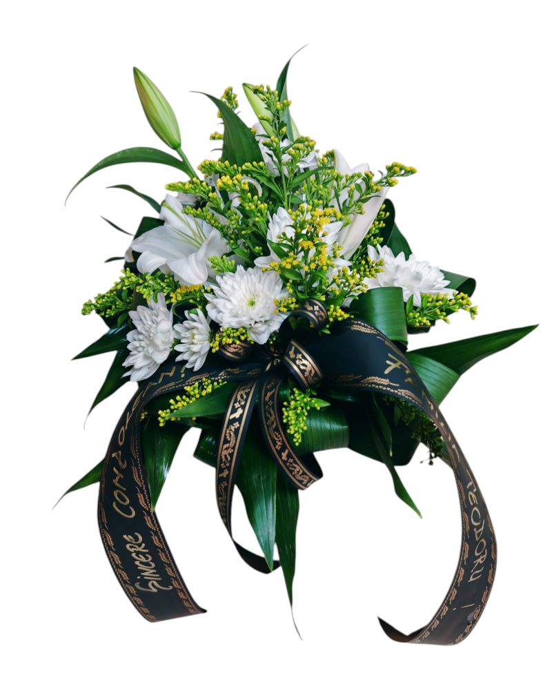Un aranjament floral funerar elegant, fixat în burete umed, compus din crini, crizanteme, solidago și frunze verzi decorative. Crinii adaugă rafinament, crizantemele exprimă respectul, iar solidago oferă accente luminoase. Frunzele conturează armonios compoziția. Aranjamentul este completat cu o panglică funerară inscripționată, transmisă ca un omagiu adus persoanei dragi.