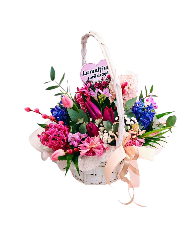 Coș floral delicat și plin de prospețime, realizat din flori parfumate de primăvară – zambile, lalele și frezii – completate armonios de frunze de eucalipt verde. Aranjamentul impresionează prin culori vii, texturi variate și un parfum natural intens, specific sezonului de primăvară.