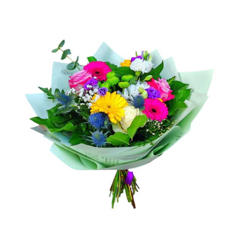 Un buchet plin de viață și personalitate, creat dintr-o combinație armonioasă de flori în nuanțe vibrante și delicate. Mini gerbera galbene și fucsia aduc un plus de energie și prospețime, în timp ce trandafirii mov și albi adaugă eleganță și romantism.