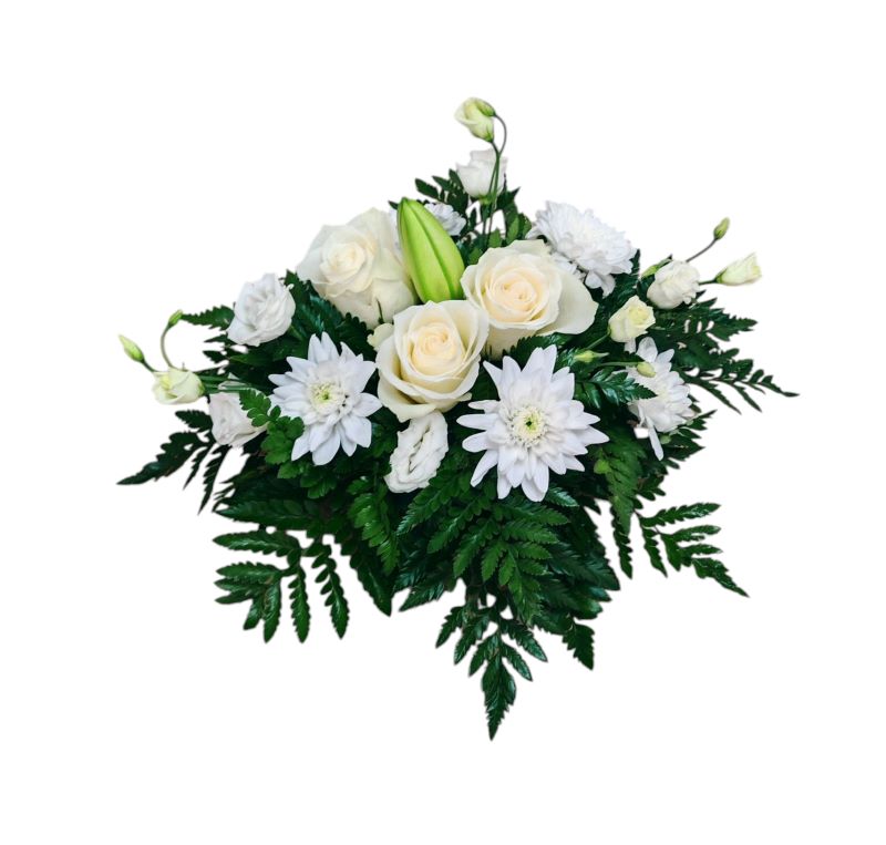 Un aranjament floral cu aer nobil și echilibru natural, realizat în burete umed pentru a menține prospețimea florilor. Compoziția este formată din frunze verzi decorative, trandafiri albi eleganți, crizanteme pline și crenguțe de lisianthus, iar în centrul aranjamentului se află un boboc de crin – simbol al purității și spiritualității.